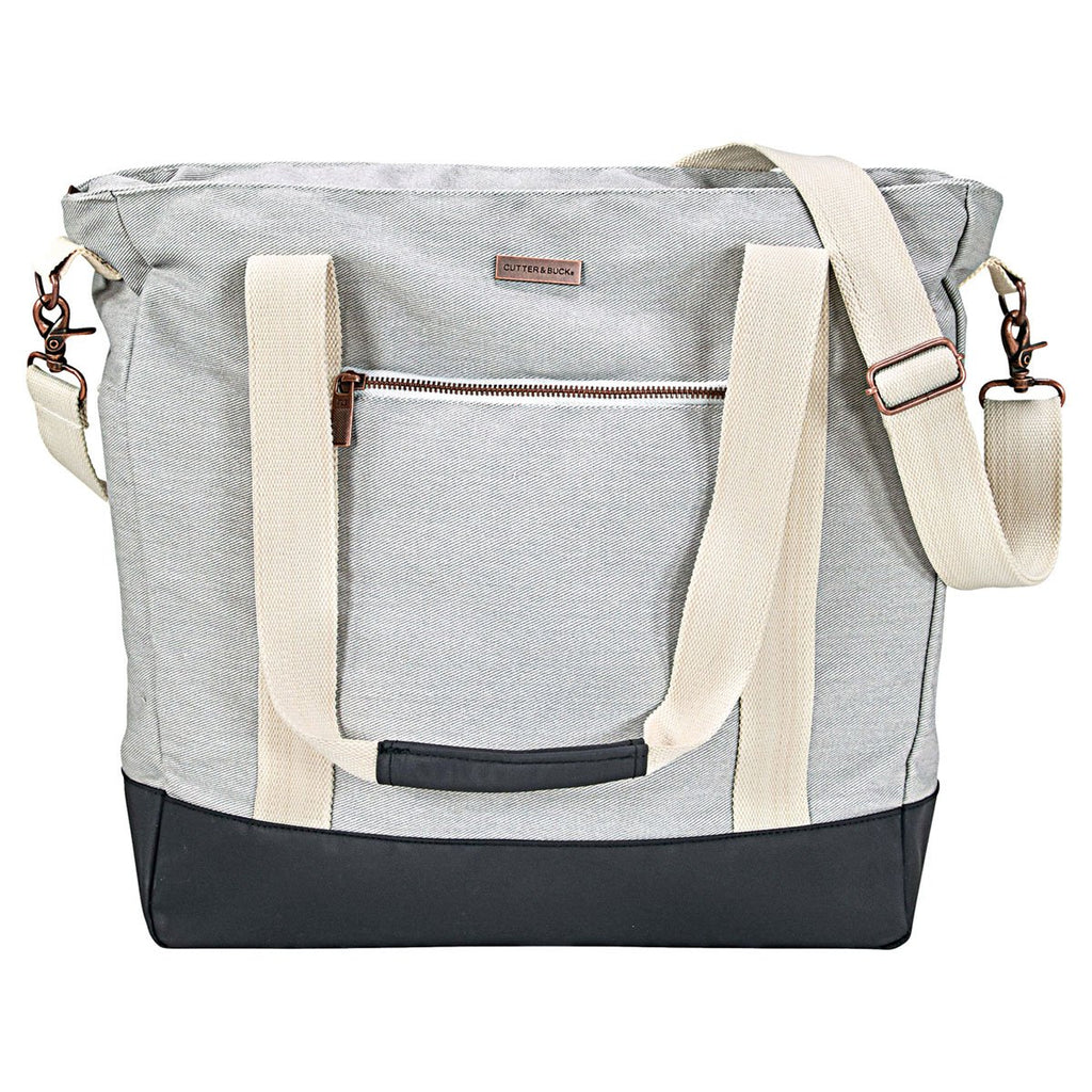 The Cutter & Buck Grey Cotton Computer Tote includes a padded sleeve for securing a laptop on the inside. The design of the tote is comfortable with comfortable padded handles and a sturdy shoulder strap. The tote is helpful for workers on the go. The custom logo space on the side lets people in an airport or any other spot one might travel out to know about your business.
