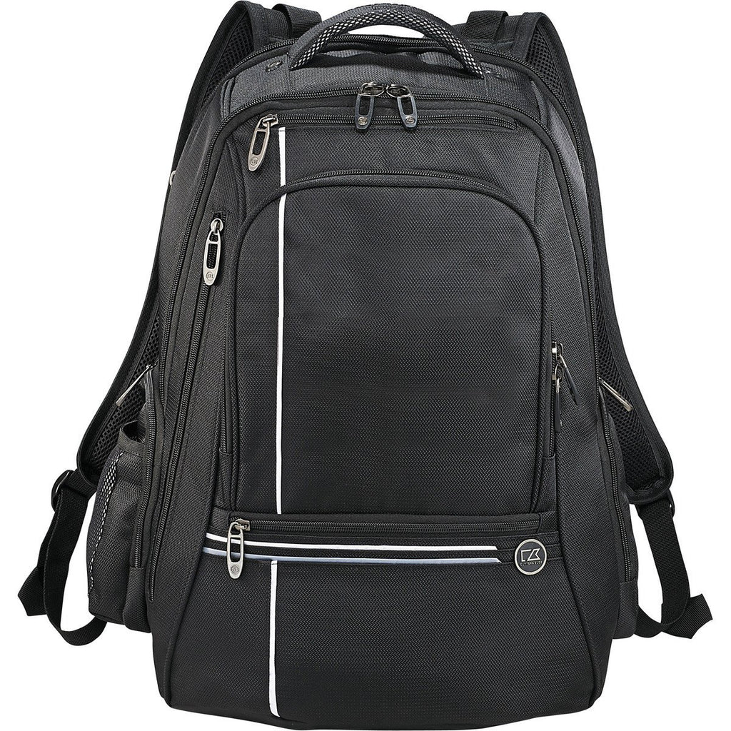 The minimum order for this product is 6 piecesMade for a wide variety of uses, the Cutter & Buck Black Tour TSA 17" Computer Backpack does much more than protect your laptop during morning and evening commutes. The durable backpack also makes an excellent storage option for the clothes and accessories you need for extended camping excursions. Durable vinyl covers the bottom of the backpack to prevent impact and moisture damage. The padded back and compression shoulder straps balance heavy loads to spread the weight across your back and shoulders. Cutter & Buck designed the back panel to include a trolley handle that gives you more movement flexibility through crowded airport terminals. Add a custom logo to reach potential customers during business trips.
