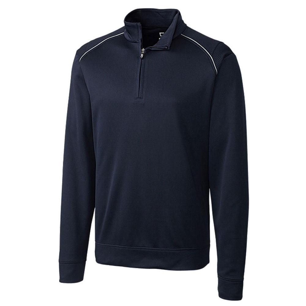 Stay warm in the Cutter & Buck Men's Navy Blue Tall WeatherTec Ridge Half-Zip. With the addition of your custom logo, this half-zip is a great way to market your company. The brilliant polyester body offers a comfortable surface to wear in the winter. The lightweight design includes a self-fabric mock collar that bends well and flexes with one's movements. A slight white line can be found on the top part of the outfit. The classic appearance adds a modern look to the outfit. Try this design out if you're looking for a classic approach that has a handsome style of its own for corporate athletic outings. This may also do well as a corporate jacket uniform for cooler times in the year.Highlights