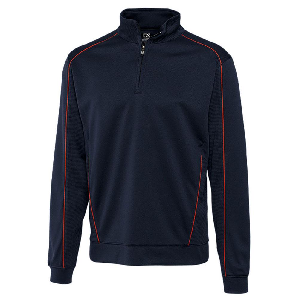 With the addition of your company's custom logo, the Cutter & Buck Men's Navy Blue/Cardinal Red Tall DryTec Edge Half-Zip will make your workers smile. This half-zip is great for use at casual occasions during the fall and winter. The polyester body pairs with a mock collar and a half-zip front for a modern look. Some small grooved accents can be found along the shoulders, sleeves, and sides to establish a comfortable style that allows air to move along. The inside lining is comfortable as well. The design on the half-zip outfit is suitable for many outside needs and does well for golf outings, outdoor recruiting events, and much more.Highlights