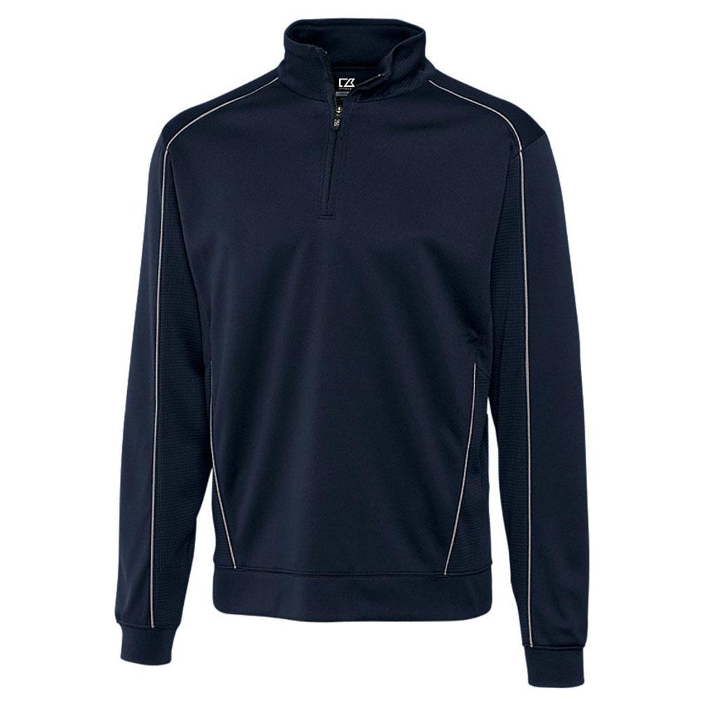 With the addition of your company's custom logo, the Cutter & Buck Men's Navy Blue Tall DryTec Edge Half-Zip will make your workers smile. This half-zip is great for use at casual occasions during the fall and winter. The polyester body pairs with a mock collar and a half-zip front for a modern look. Some small grooved accents can be found along the shoulders, sleeves, and sides to establish a comfortable style that allows air to move along. The inside lining is comfortable as well. The design on the half-zip outfit is suitable for many outside needs and does well for golf outings, outdoor recruiting events, and much more.Highlights