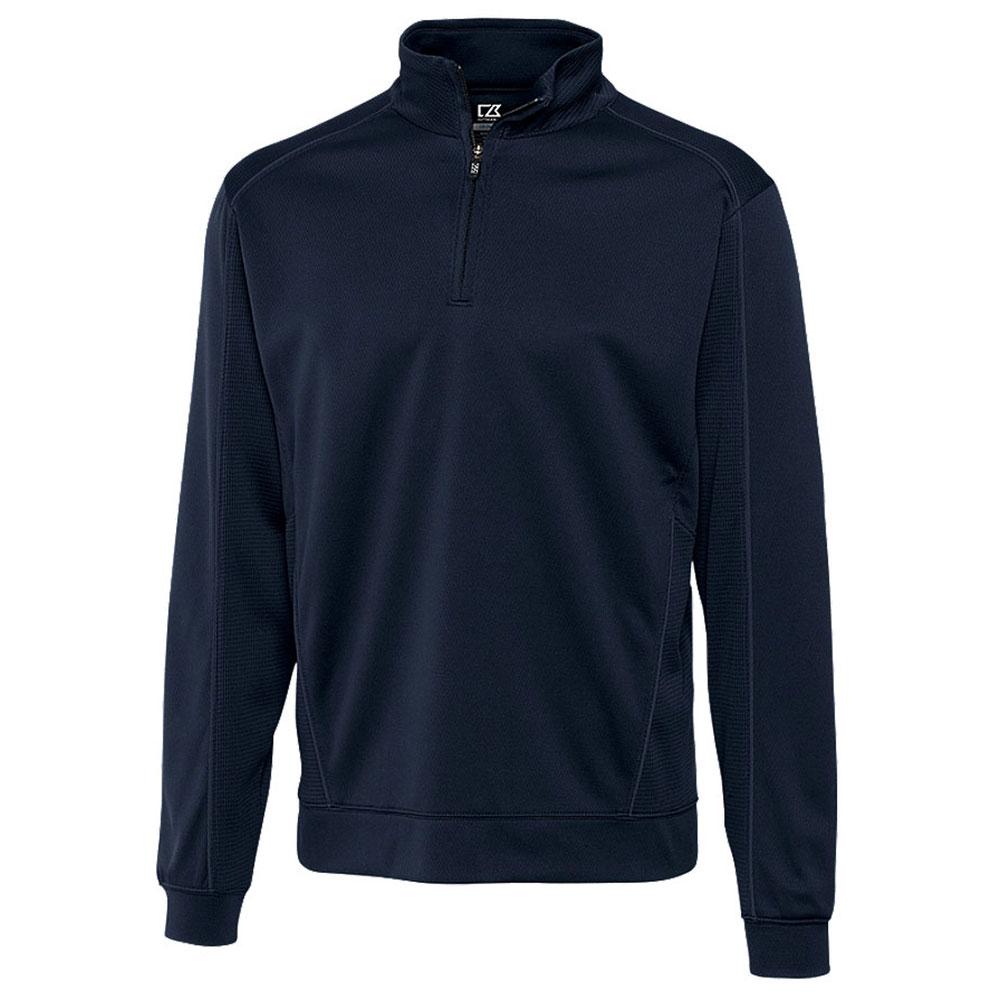 With the addition of your company's custom logo, the Cutter & Buck Men's Solid Navy Blue Tall DryTec Edge Half-Zip will make your workers smile. This half-zip is great for use at casual occasions during the fall and winter. The polyester body pairs with a mock collar and a half-zip front for a modern look. Some small grooved accents can be found along the shoulders, sleeves, and sides to establish a comfortable style that allows air to move along. The inside lining is comfortable as well. The design on the half-zip outfit is suitable for many outside needs and does well for golf outings, outdoor recruiting events, and much more.Highlights