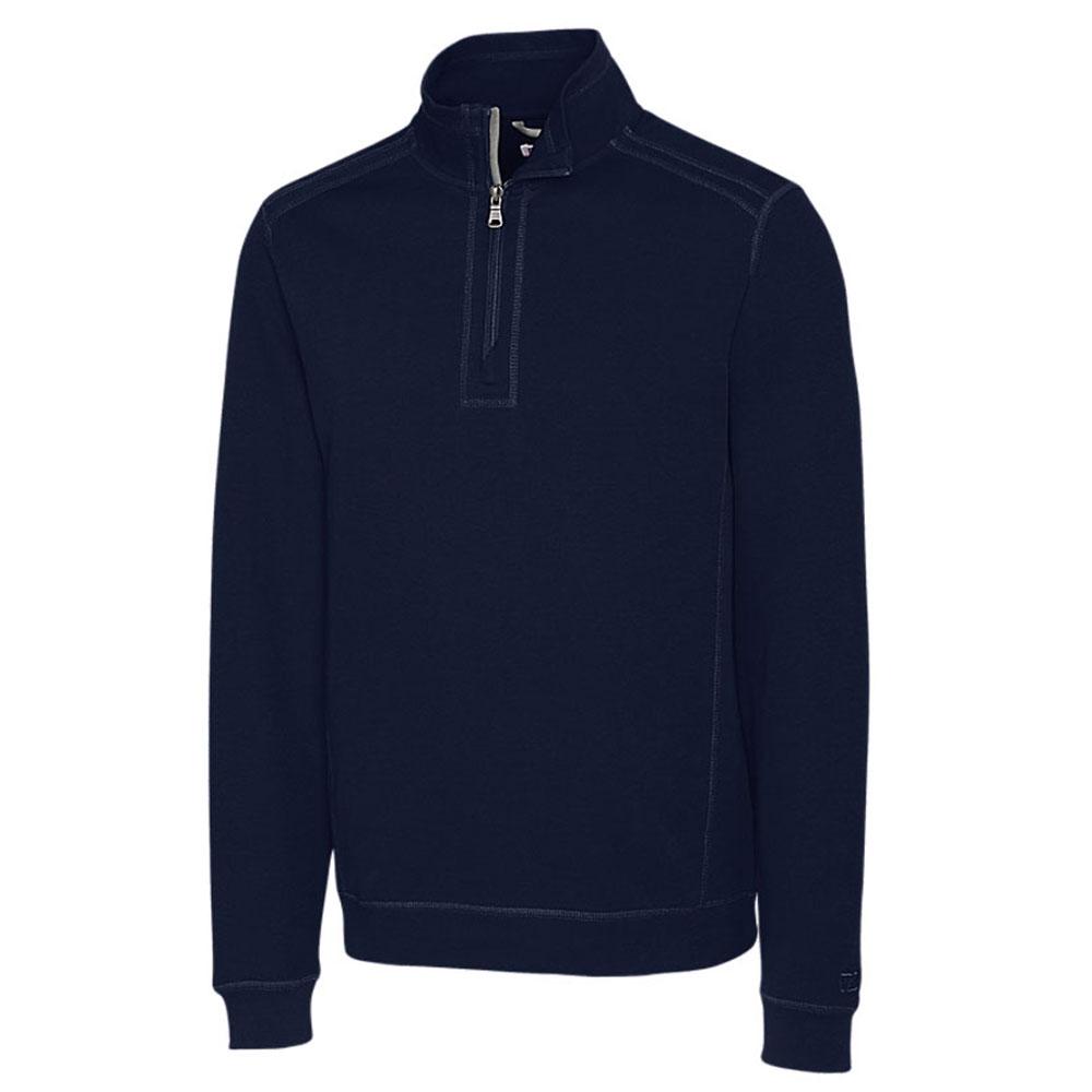 The Cutter & Buck Men's Liberty Navy Tall Bayview Half-Zip has a series of distinguished stitching features that would complement your company's custom logo well. The design adds a unique look for athletic events and can work for runners in the fall and others who are active during the cooler times of the year. With the addition of your custom logo, the quality design of this half-zip makes this a fine gift for long-tenured employees or those who have participated in certain business-related programs. The design offers a thick series of stitches around its body, including some along the half-zip design. The cotton fabric makes this a comfortable layering piece that your employees will appreciate.Highlights