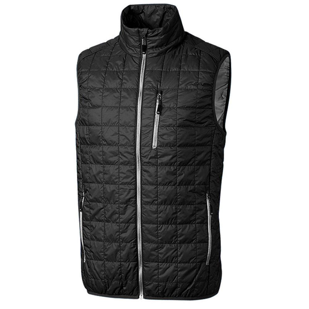 Stay warm with the Cutter & Buck Men's Black Tall Rainier Vest. With the addition of your company logo, this vest is the perfect way to market your company in a fashionable way. The vest has a full-length zipper at the front plus a smaller zipper near the middle for a breast pocket space. Added zippers are included for traditional hand pockets on both sides. The surface comes with a padded nylon feature with taffeta insulation to keep you warm. The brilliant and soft surface adds a comfortable space for any special outing of interest to you. Try this out for a special winter event or other cool-weather activity at your business. This is a nice prize for company events in the winter. Don't forget to add a brilliant custom logo on the surface.Highlights