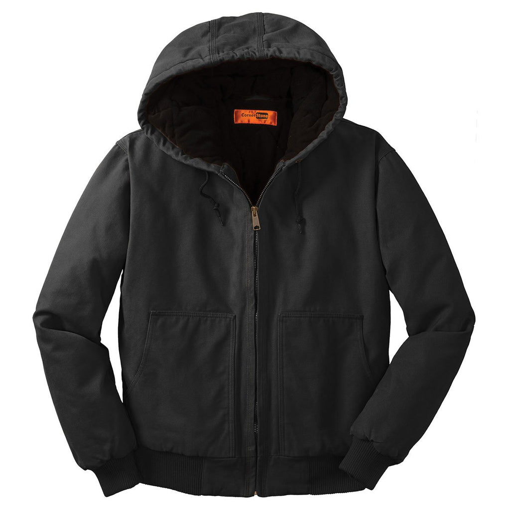 Construction workers that work outdoors in frigid climates need protection against the brutal elements. The CornerStone Men's Black Washed Duck Cloth Insulated Hooded Work Jacket provides the protection you need against frostbite. However, the insulated workwear also enhances your on the job comfort to make it a favorite among construction workers. The enzyme-washed hood jacket presents a subtle worn-in appearance that maintains the rugged durability of duck cloth. Eight-ounce polyfill provides the insulation that keeps you warm and removes perspiration to keep you comfortable throughout your workday. The uniquely designed hood includes antique brass eyelets and a dyed-to-match draw cord to create a jacket that turns the head of your fellow workers. Construction site managers promote their company by adding a custom logo on the left side of the chest.Highlights