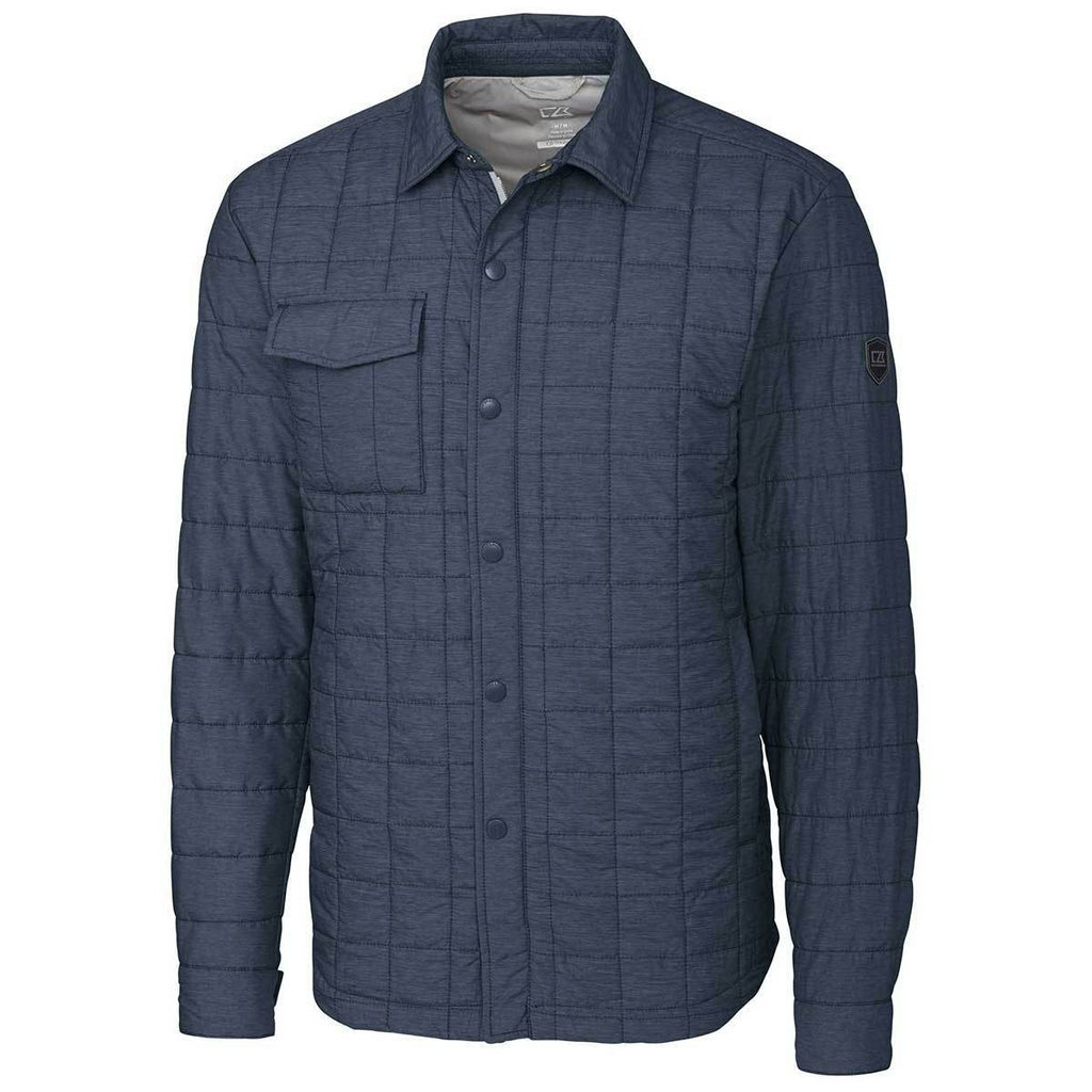 The Cutter & Buck Men's Anthracite Melange Rainier Shirt Jacket takes two classic pieces of apparel and pairs them together to create a unique piece that defies convention. Its sleek design is the perfect pick if you are looking for a versatile item to show off your company or team's custom logo or design. Design elements like the shirt collar and front chest pocket make it look like a traditional button-down. Primaloft insulation, water-resistant fabric, and a quilted pattern, however, make it ideal for wear even in inclement weather conditions.Highlights