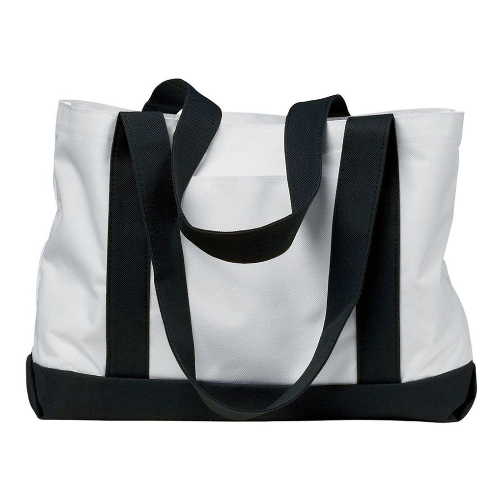 With a large imprint area to attach your corporate logo, the popular UltraClub White/Black P&O Cruiser Tote bag offers your company a cost effective way to advertise your brand at civic and professional networking events. The rugged fabric resists the types of rips and tears that send other types of tote bags to the recycling bin. Store everything you need for business travel inside of the spacious primary compartment. You can even bring electronic devices, such as a tablet and Smartphone, on board business flights. Use the large carrying straps to balance heavy loads against your hips for enhanced movement flexibility.