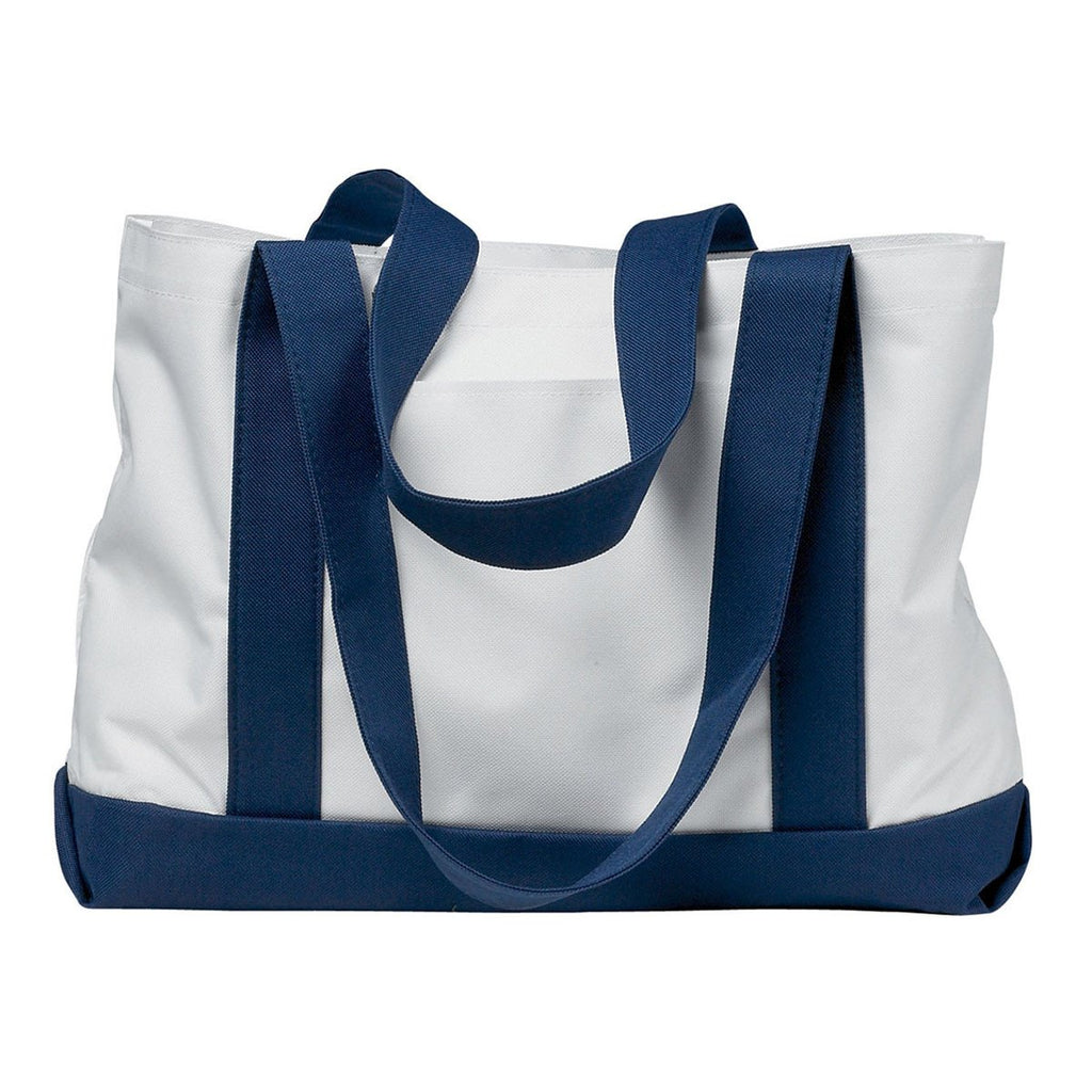 The minimum order for this product is 12 piecesWith a large imprint area to attach your corporate logo, the popular UltraClub White/Navy P&O Cruiser Tote bag offers your company a cost effective way to advertise your brand at civic and professional networking events. The rugged fabric resists the types of rips and tears that send other types of tote bags to the recycling bin. Store everything you need for business travel inside of the spacious primary compartment. You can even bring electronic devices, such as a tablet and Smartphone, on board business flights. Use the large carrying straps to balance heavy loads against your hips for enhanced movement flexibility.