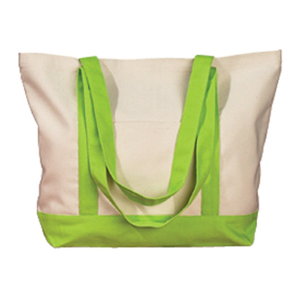 The minimum order for this product is 12 piecesYou might not think that a 100% cotton tote bag can handle the punishment inflicted on it at crowded markets. The 100% cotton BAGedge Natural/Lime 12 oz Canvas Boat Tote bag resists the types of rips and tears that render other brand tote bags obsolete. Long carrying handles allow you to balance heavy loads against your hip to give you more movement flexibility in tight grocery store aisle. Place the tote on your right shoulder to grab a carton of milk out of the refrigeration unit and then quickly move the tote bag to the left shoulder to allow a customer to pass you by. Add a custom logo to promote your business to potential customers that shop at the same grocery and department stores.