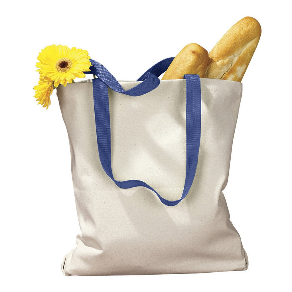 The minimum order for this product is 24 piecesYou might not think that a 100% cotton tote bag can handle the punishment inflicted on it at crowded markets. The 100% cotton BAGedge Natural/Royal 12 oz Canvas Tote with Insert Color here Handles bag resists the types of rips and tears that render other brand tote bags obsolete. Long carrying handles allow you to balance heavy loads against your hip to give you more movement flexibility in tight grocery store aisle. Place the tote on your right shoulder to grab a carton of milk out of the refrigeration unit and then quickly move the tote bag to the left shoulder to allow a customer to pass you by. Add a custom logo to promote your business to potential customers that shop at the same grocery and department stores.