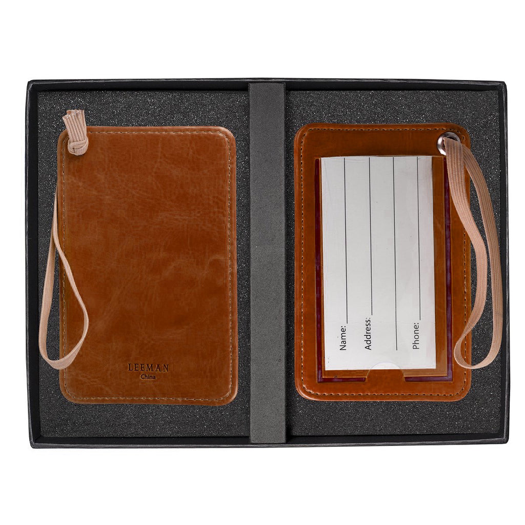Ready to take your business logo on the road? This practical marketing tool will "tag" along nicely to your company's promotional events. Leeman Tan Venezia Luggage Tag Set is made from PU material and features a clear PVC display window. Designed with an elastic strap for attaching to baggage. Add your logo to create a handy giveaway during conferences and trade shows. An excellent promo item for travel agencies, tour companies and airlines. Comes complete with gift box.The minimum order for this product is 48 pieces.