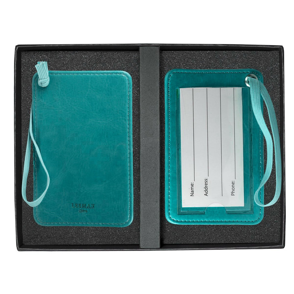 Ready to take your business logo on the road? This practical marketing tool will "tag" along nicely to your company's promotional events. Leeman Teal Venezia Luggage Tag Set is made from PU material and features a clear PVC display window. Designed with an elastic strap for attaching to baggage. Add your logo to create a handy giveaway during conferences and trade shows. An excellent promo item for travel agencies, tour companies and airlines. Comes complete with gift box.The minimum order for this product is 48 pieces.