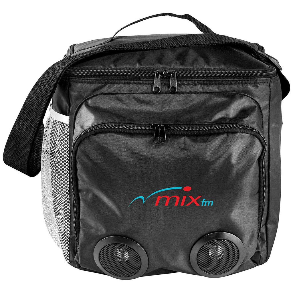 The Bullet Black Speaker 12-Can Event Cooler can be a handy promotional item with your corporate logo, featuring battery-powered speakers that are compatible with most mobile devices. It would make a neat gift to show employee appreciation. You also could hand out this logoed bag at recruiting events or as a corporate giveaway.The minimum order for this product is 24 pieces.