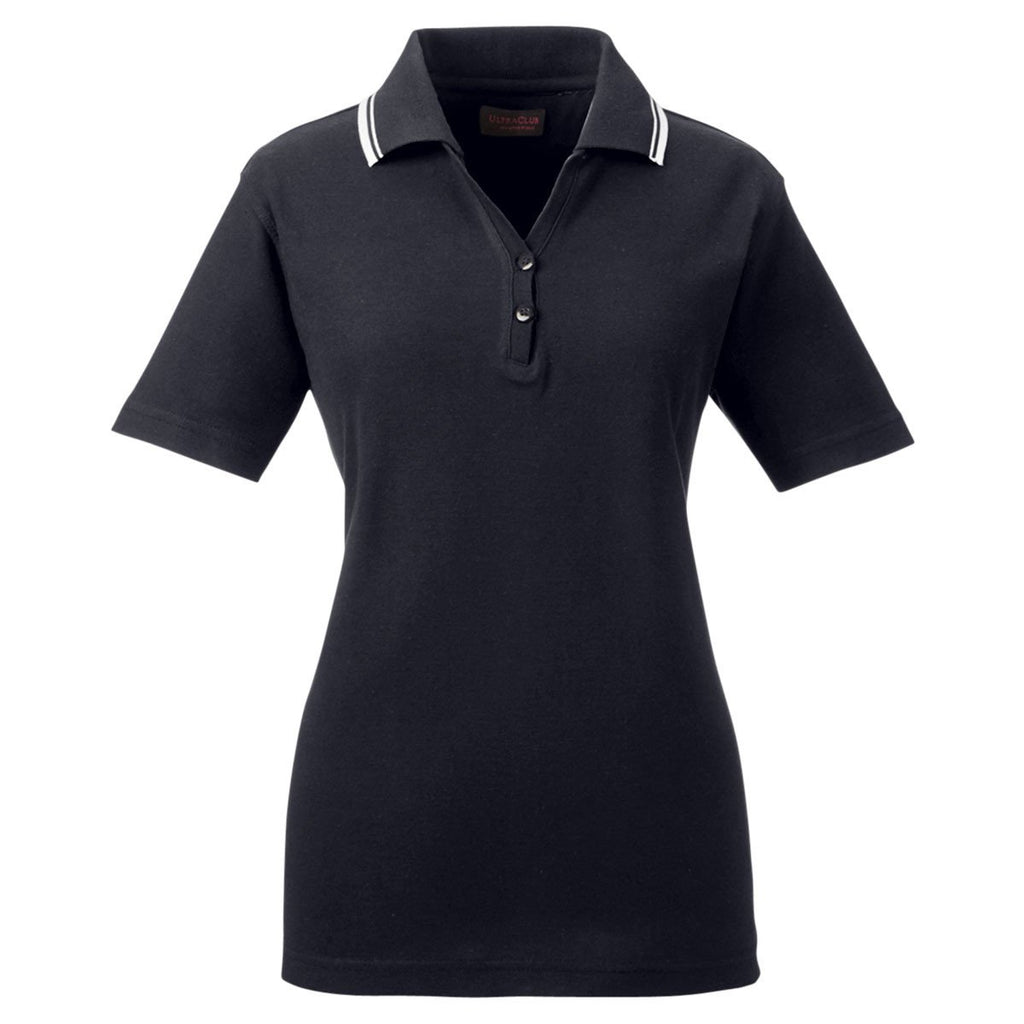 UltraClub Women's Black/White Short-Sleeve Whisper Pique Polo with Tipped Collar