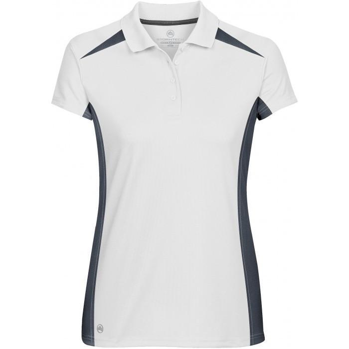 The Stormtech Women's White/Navy Match Technical Polo redefines the phrase "sporty style". With two-tone contrast side panels, it will easily draw attention to your corporate embroidered logo. With moisture-wicking material and a modern fit with stretch, it may also become your employees' and customers' next favourite everyday shirt.Corresponding Men's Style: Stormtech Men's White/Navy Match Technical Polo