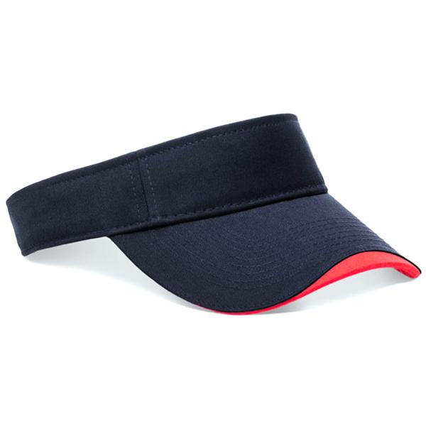 Keep the sun out of your eyes in a custom embroidery Pacific Headwear Navy/Red Polo Twill Hook-And-Loop Visor in four color combinations. The front panel in cotton fabric makes the ideal canvas for your corporate embroidery or company logo in nearly every color. A pro-stitched finish and contrast binding under visor means this visor will stand the test of time even if you wear it daily. Use this as an accessory on the next corporate retreat or to wear to your favorite sporting events. Add a custom logo and use as part of employee apparel to complete a uniform that is completely unique. Choose the design that best represents your company and place an order today.Highlights