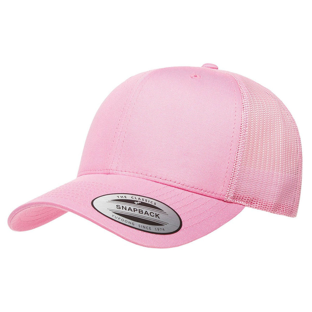 You don't have to give the Yupoong Pink Adult Retro Trucker Cap to actual truckers. With your company's custom logo on the bill, this premium hat will be valued and worn by any man. Just think what a great item this would be to hand out at trade shows! It has a six panel construction with eight row stitching on the flat visor. It has hard buckram backed front panels, 3 1/2" crown, and matching undervisor. A sure fit is ensured with an adjustable plastic closure. This trucker cap is available in 11 colors. Five are solids like black, red, and pink. The remainder are two-color combinations such as brown and khaki, and navy and white.