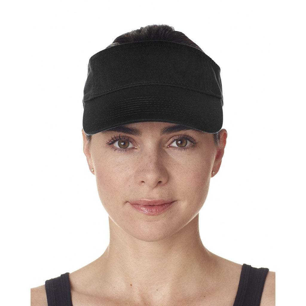 Wear the versatile UltraClub Women's Black Classic Cut Chino Cotton Twill Visor for all the sports you play. The long bill provides protection against the sun during corporate softball games. On sweltering days at your favorite golf course, the open top circulates air to keep your head comfortably cool. One-hundred percent washed cotton endures daily use to give you years of high performance headwear. The pre-curved visor allows you to let as much of the sun as you want to hit your face. Matching self-adhesive closure ensures you enjoy a snug fit throughout every softball game. Add your corporate logo to increase awareness of your company at outdoor recreational events.Highlights