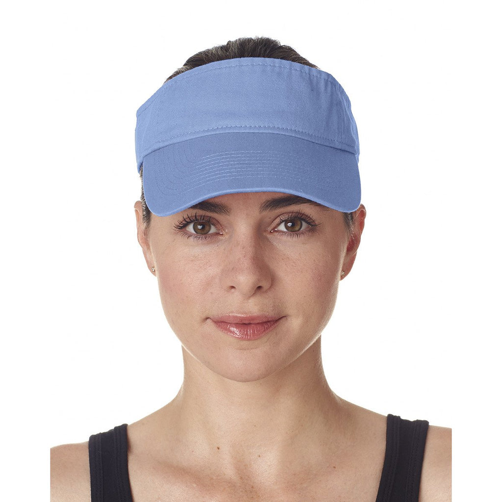 Wear the versatile UltraClub Women's Light Blue Classic Cut Chino Cotton Twill Visor for all the sports you play. The long bill provides protection against the sun during corporate softball games. On sweltering days at your favorite golf course, the open top circulates air to keep your head comfortably cool. One-hundred percent washed cotton endures daily use to give you years of high performance headwear. The pre-curved visor allows you to let as much of the sun as you want to hit your face. Matching self-adhesive closure ensures you enjoy a snug fit throughout every softball game. Add your corporate logo to increase awareness of your company at outdoor recreational events.Highlights