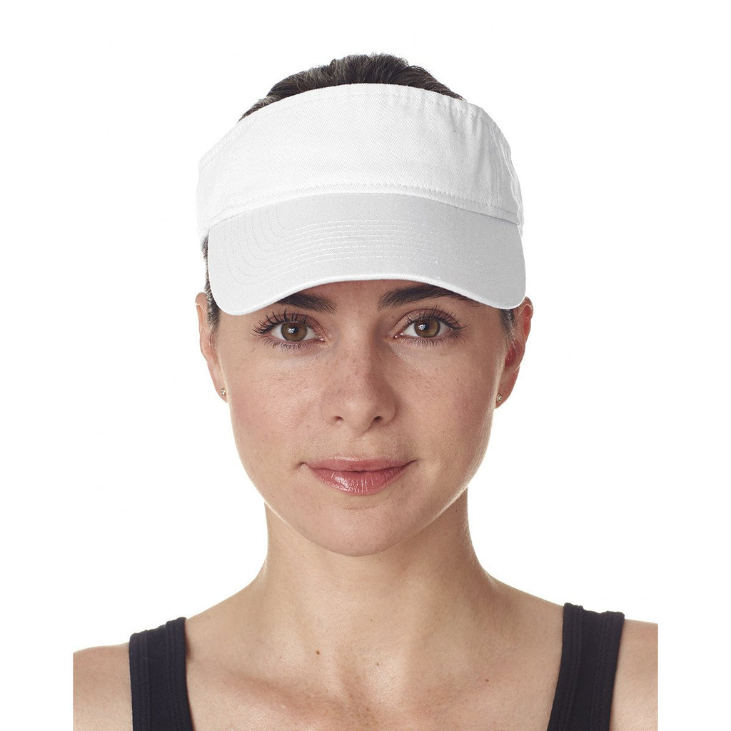Wear the versatile UltraClub Women's White Classic Cut Chino Cotton Twill Visor for all the sports you play. The long bill provides protection against the sun during corporate softball games. On sweltering days at your favorite golf course, the open top circulates air to keep your head comfortably cool. One-hundred percent washed cotton endures daily use to give you years of high performance headwear. The pre-curved visor allows you to let as much of the sun as you want to hit your face. Matching self-adhesive closure ensures you enjoy a snug fit throughout every softball game. Add your corporate logo to increase awareness of your company at outdoor recreational events.Highlights