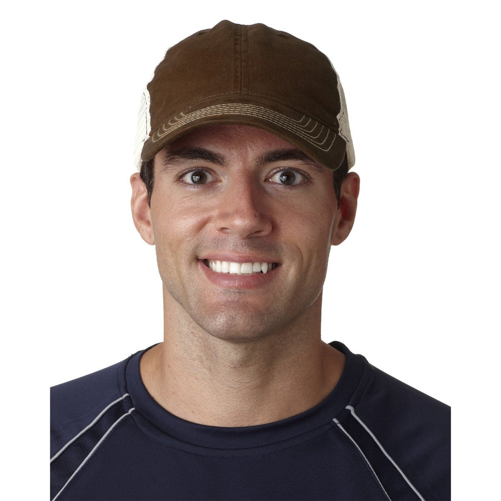 UltraClub Men's Brown/Stone Classic Cut Brushed Cotton Twill Unstructured Trucker Cap