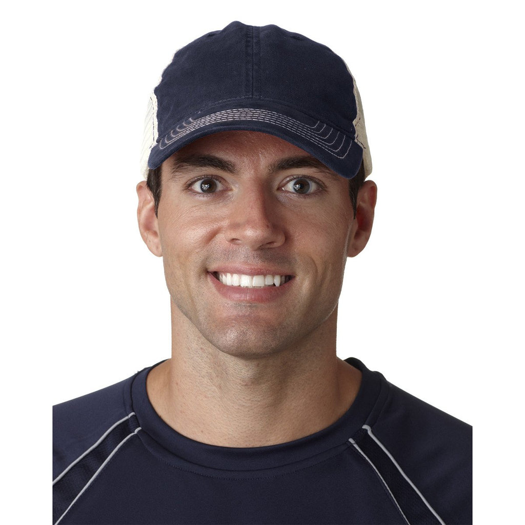 UltraClub Men's Navy/Stone Classic Cut Brushed Cotton Twill Unstructured Trucker Cap