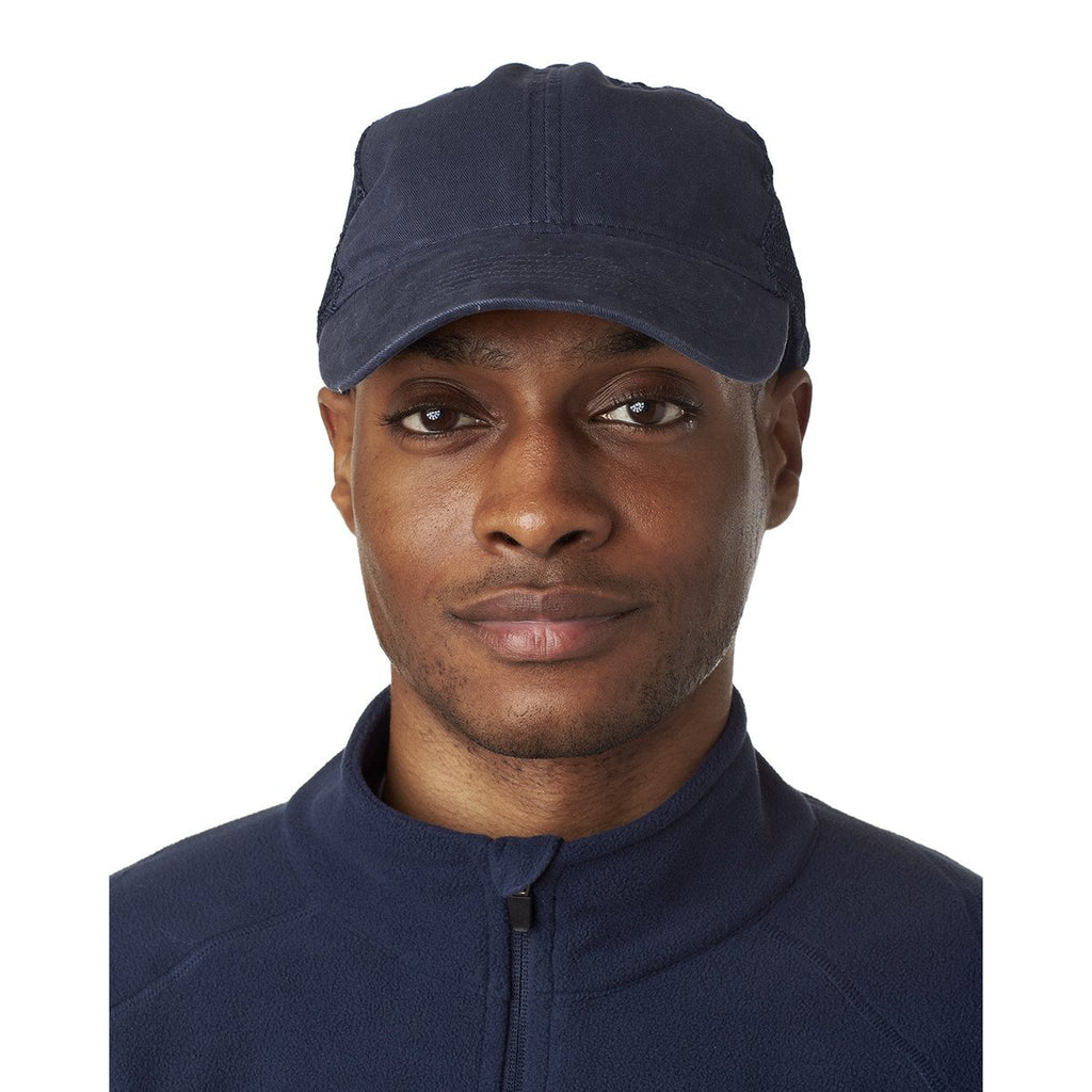 With a polyester mesh back, the UltraClub Men's Navy/Navy Classic Cut Brushed Cotton Twill Unstructured Trucker Cap allows air to circulate and enhance your comfort during steamy hot summer days. The invigorating feeling of a dry, cool head gives you an advantage over the other softball team. Super soft 100% cotton never succumbs to the rigors of frequent use. The low-profile cap contains six rugged panels that improve the strength of the high-performance hat. Contrast stitching creates a stylish design element that your professional peers notice at business seminars. Attach your company logo to take advantage of the attention.Highlights