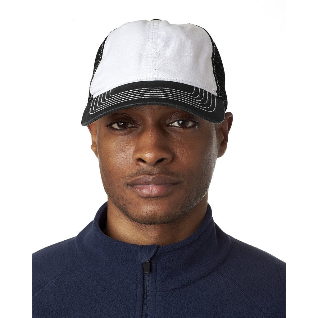 UltraClub Men's White/Black Classic Cut Brushed Cotton Twill Unstructured Trucker Cap
