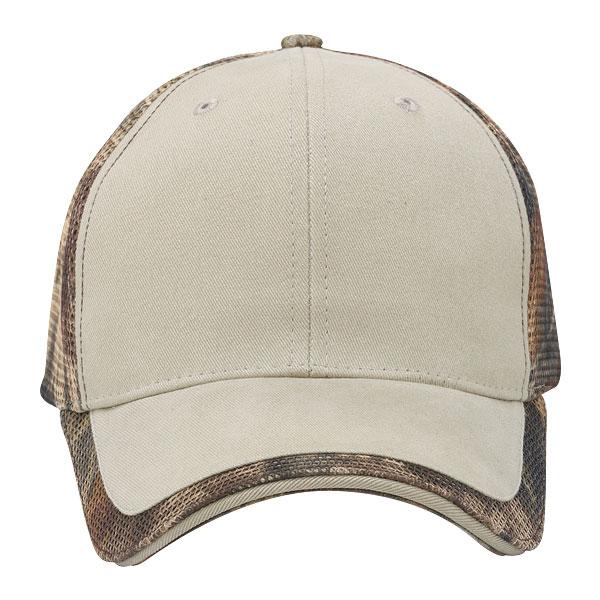 The Paramount Apparel Khaki/Realtree Xtra Brown Camo Mesh Cap has a strong design, featuring a solid surface that makes the perfect canvas for a company logo. The camo print around the outside part of the bill will make any custom branding stand out. The brushed twill surface is comfortable with a fine mesh body on the back area. The camo layout spreads through the entire mesh to create a memorable tone. You can order this as a special cap to give away when promoting outdoor-themed events or offers at your business site. The elaborate and detailed mesh surface will add something everyone will want to show off anywhere they go.