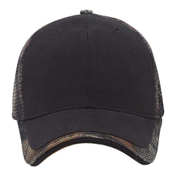 The Paramount Apparel Black/Realtree Xtra Brown Camo Mesh Cap has a strong design, featuring a solid surface that makes the perfect canvas for a company logo. The camo print around the outside part of the bill will make any custom branding stand out. The brushed twill surface is comfortable with a fine mesh body on the back area. The camo layout spreads through the entire mesh to create a memorable tone. You can order this as a special cap to give away when promoting outdoor-themed events or offers at your business site. The elaborate and detailed mesh surface will add something everyone will want to show off anywhere they go.