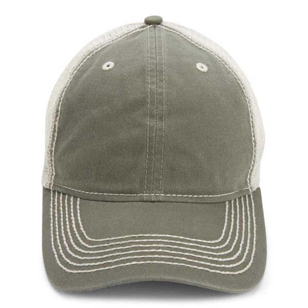 The weathered style of the Paramount Apparel Elmwood/Ivory Heavy Washed Cap produces a fun canvas to feature your company's custom logo on. The fun look features a white mesh surface with a cotton twill front and a fashionable heavy wash texture. This creates a worn look that shows just how active you are and that you have been working well to take care of all your tasks on the job. It is nice for wear in a garage or maintenance field, but it can also be useful as a gift for people who want something that looks natural and simple. The support for an added logo on the front helps too.Highlights