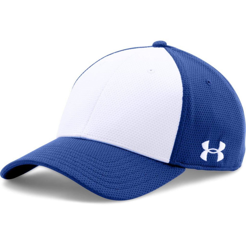 This custom Under Armour Royal/White Color Blocked Blitzing Cap checks off all the boxes when it comes to corporate headwear. These hats come in a classic and timeless style with a curved brim and fitted back and these personalized two-toned blue and white baseball caps are made from 100% polyester performance fabric that's designed to be breathable and moisture-wicking so your head stays cool and dry from the golf course to the workplace. Plus, the UA log is on the side of the hat, leaving a prominent space front and center for your custom embroidered company logo.