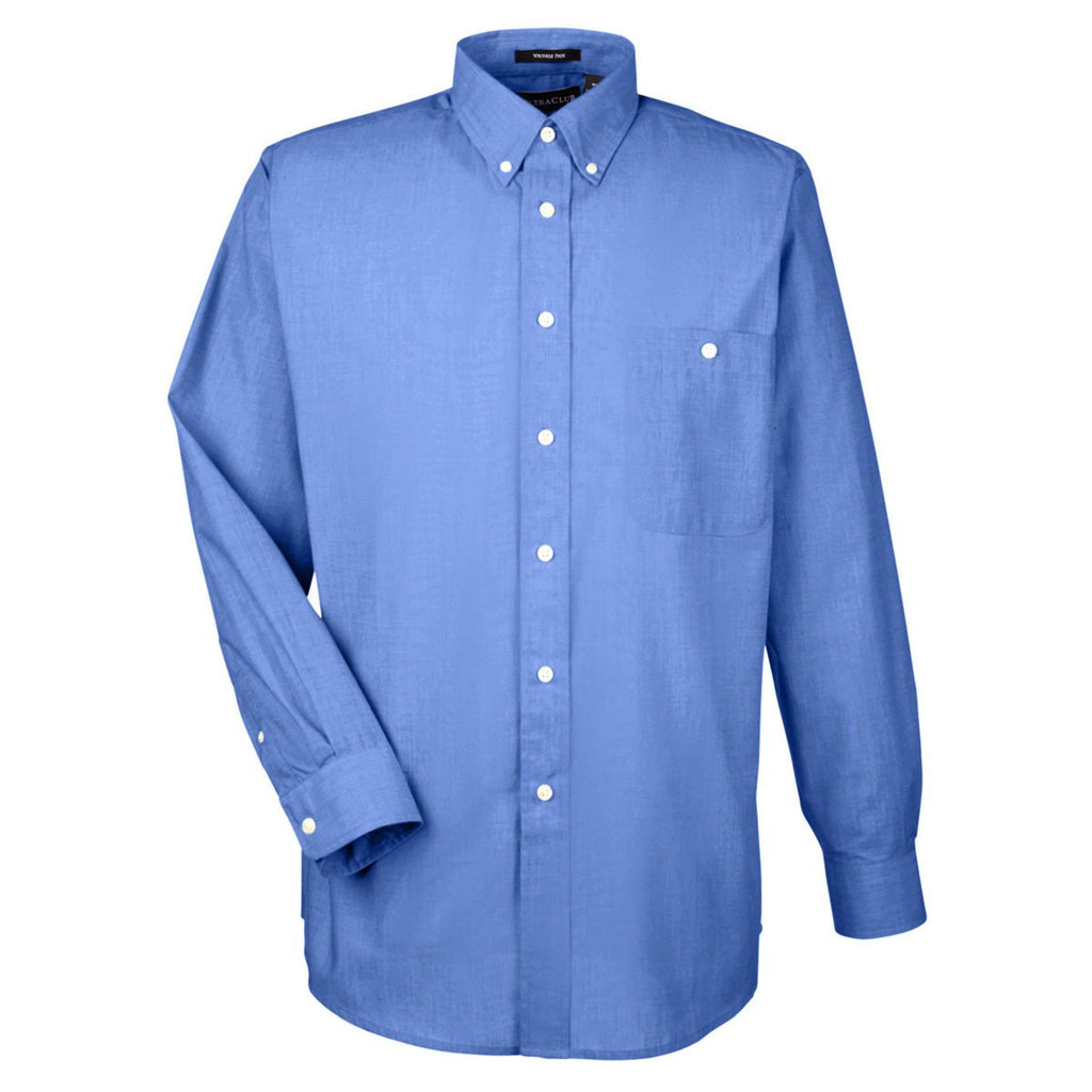Two-button adjustable cuffs put the UltraClub Men's French Blue Wrinkle-Resistant End-on-End at the head of the dress shirt fashion class. The 40% polyester and 60% cotton blended shirt resists the types of rips and tears that damage other styles of dress shirts. Wrinkle-resistant to keep you looking fresh all day long, the refined looking shirt offers you fashion versatility. Wear the shirt to an office meeting and keep it on after work hours at your favorite restaurant. The left chest pocket offers a convenient place to store your cell phone for quick access. Attach your corporate logo to get the word out about your products and services.Corresponding Women's Style: UltraClub Women's French Blue Wrinkle-Resistant End-on-End