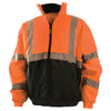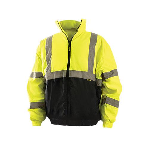 Stay visible, keep warm, and look good with OccuNomix Men's Yellow Value Black Bottom Bomber Jacket. It is made from incredibly durable and ANSI 107 compliant Polyester 300 Denier Oxford with PU coating and comes loaded with great features. The jacket features a 2" Silver reflective tape for optimal night time visibility and a convenient front zipper closure with inside storm flap that keeps out the wind and rain. Designed with a fleece-lined collar and quilted polyester lining for maximum warmth and comfort. Roll-away hood and two lower front pockets keep you comfortable during outdoor endeavors.Highlights