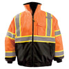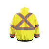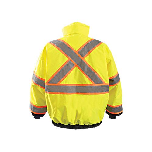 The OccuNomix Men's Yellow Black Bottom 2-in-1 X Back Bomber Jacket is CSA Z96-15-compliant for high-visibility outerwear. Engineered to provide comfort, safety, and warmth, this jacket features an easy on and off zip-out quilted lining. Other highlights include a Mic tab, roll-away hood and a convenient front zipper closure with inside storm flap that keeps out the wind and rain. Designed with a fleece-lined collar and quilted lining for maximum warmth and comfort on your outdoor endeavors. Two inside pockets, two lower front pockets with zipper closure, pencil pockets with two compartments and one front flap pocket.Highlights