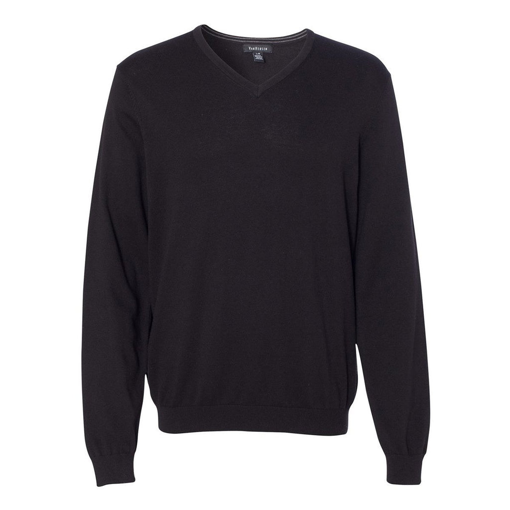 Sometimes, it's just plain cold outside. But you don't want to sacrifice the quality of your outfit just to add some warm layers, either. So what do you do? You pick up one of these Van Heusen Men's Black Long Sleeve V-Neck Sweater. The cotton/rayon fabric is comfortable and insulative, giving you plenty of respite from the weather. Other details like the ribbed V-neck and cuff keep your outfit looking spiffy, easily dressed up or down. Add a custom business logo to the front and you have a wonderfully branded piece that you can use for promotions and holiday or corporate gifts.Highlights