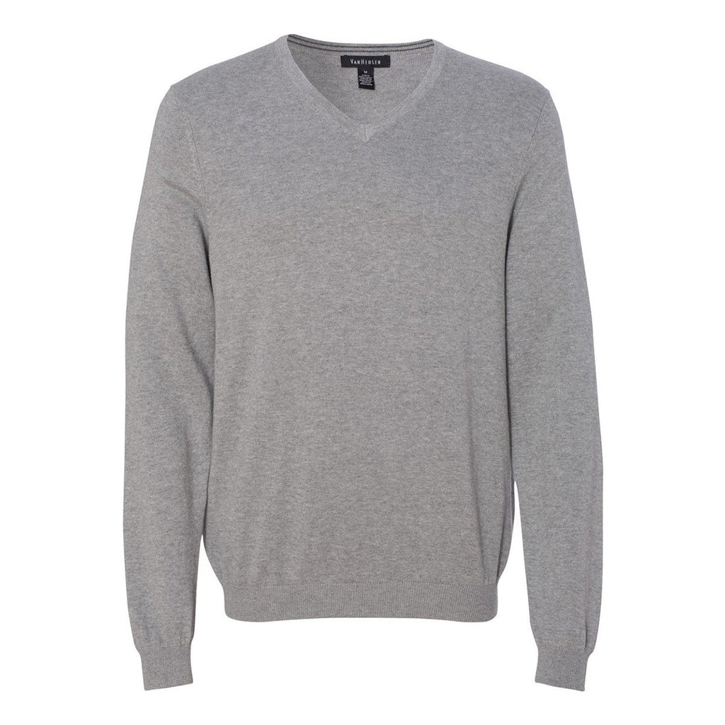 Sometimes, it's just plain cold outside. But you don't want to sacrifice the quality of your outfit just to add some warm layers, either. So what do you do? You pick up one of these Van Heusen Men's Grey Long Sleeve V-Neck Sweater. The cotton/rayon fabric is comfortable and insulative, giving you plenty of respite from the weather. Other details like the ribbed V-neck and cuff keep your outfit looking spiffy, easily dressed up or down. Add a custom business logo to the front and you have a wonderfully branded piece that you can use for promotions and holiday or corporate gifts.Highlights