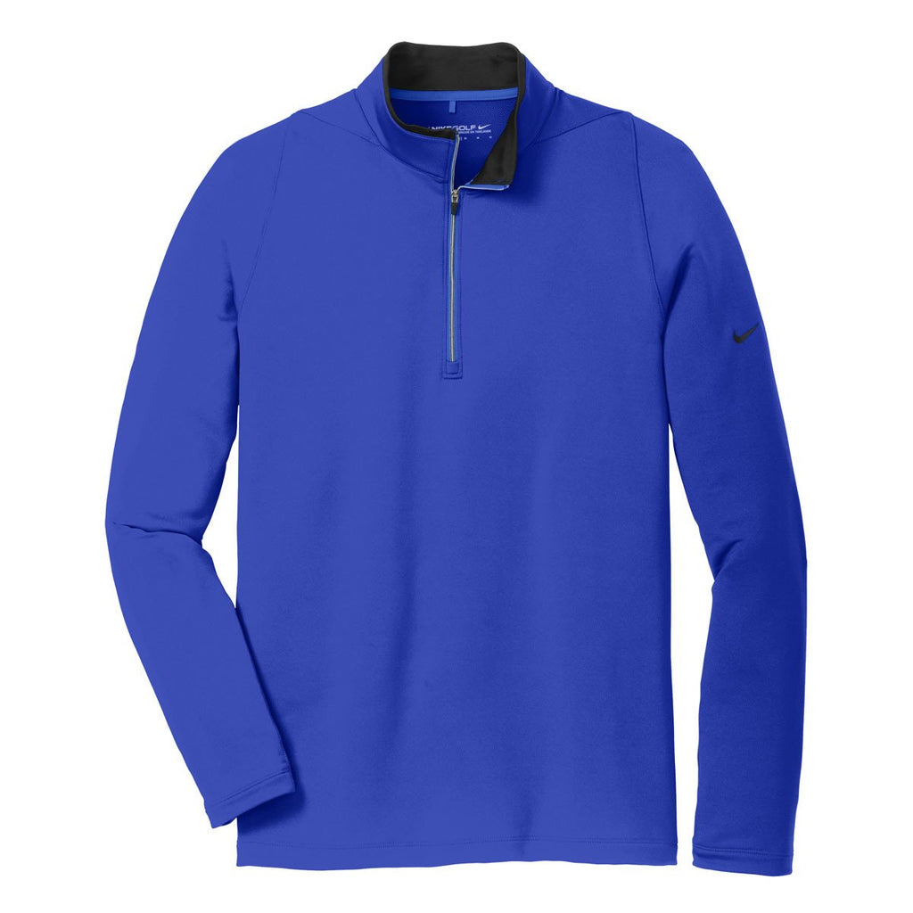 Say hello to your new favorite clothing item: the Nike Men's Royal/Black Dri-FIT Stretch 1/2-Zip. Just as comfortable on the golf course as it is in the office, this is a corporate Nike style that is clean, modern, and purposely built for your custom logo. So why does it have "stretch" in the title? It is made of a 93/7 polyester/spandex Dri-FIT fabric with just the perfect amount of stretch for movement at the driving range or in the conference room. The Dri-FIT moisture-wicking technology will keep you cool and dry, and the contrast collar and zipper, open cuffs and open hem will keep you looking great. With the trademark Swoosh on the sleeve, that means you've got a wide open left chest for your company logo. Like we said: your new favorite clothing item.Highlights