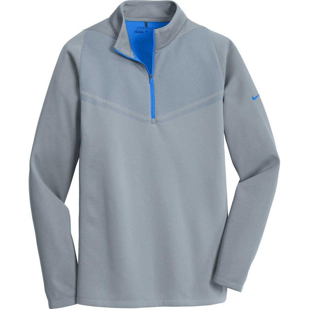 If you want to present a fashionable appearance at the driving range, you can't go wrong by donning the Nike Men's Cool Grey/Photo Blue Therma-FIT Hypervis 1/2-Zip Cover-Up. The 100% polyester Therma-FIT fabric regulates the temperature inside of the 1/2-zip jacket. FIT technology quickly removes sweat to create a cooling effect on your skin. The super soft brushed interior feels comfortable on the arms and neck. Design details include open cuffs and a reverse coil zipper. Add your company logo to the 1/2-zip cover-up to increase awareness of your brand at large professional networking events.Highlights