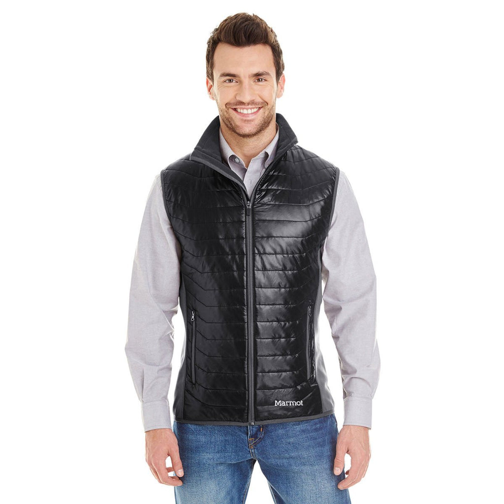 Active men have favored sleeveless vests to keep from having restricted movement, and when they see your custom logo on the Marmot Men's Black Variant Vest it will become apparent that your company respects hard work. The outer layer of the vest is nylon with a durable water repellent and SD mini ripstop. It has thermal R insulation and stretch fleece sleeves. Not only does it have an inside zippered pocket, it has zippered handwarmer pockets. It also features an elastic bound hem. This jacket is available in sizes S to 2XL and you have a choice of black or grey storm.Corresponding Women's Style:Marmot Women's Black Variant Vest