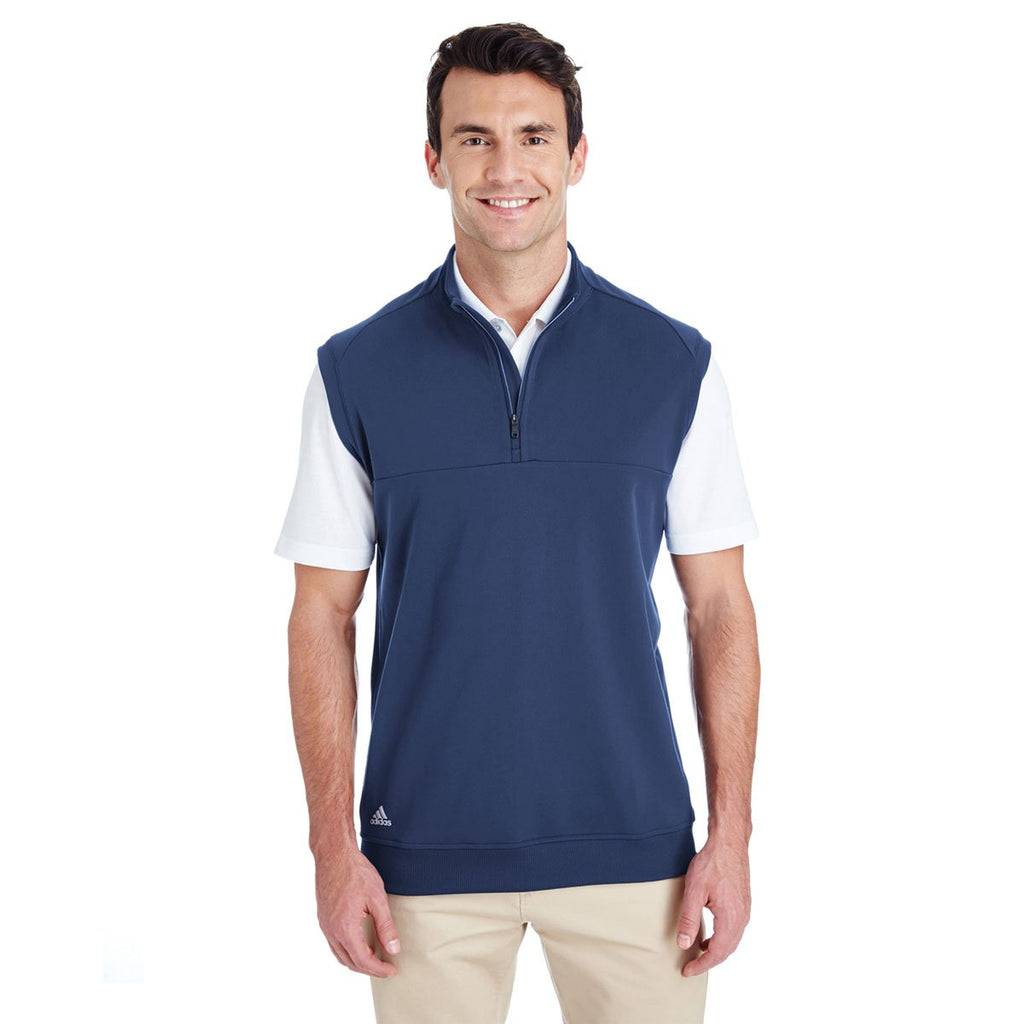 Make the custom logoed adidas Golf Men's Dark Slate Quarter Zip Club Vest the cornerstone of the next recruiting event by giving away the corporate garment to your recruiting team. The super soft fabric feels like cotton, but it is actually a blend of durable polyester and stretchable elastane. With the addition of elastane, you enjoy more mobility in the arms and shoulders. Ultraviolet ray protection prevents the sun from hurting your skin. Ribbed detailing underneath the arms adds a stylish design element that will get your employees noticed throughout the community. Attach your company logo on the large imprint area to turn the attention into sales.Highlights