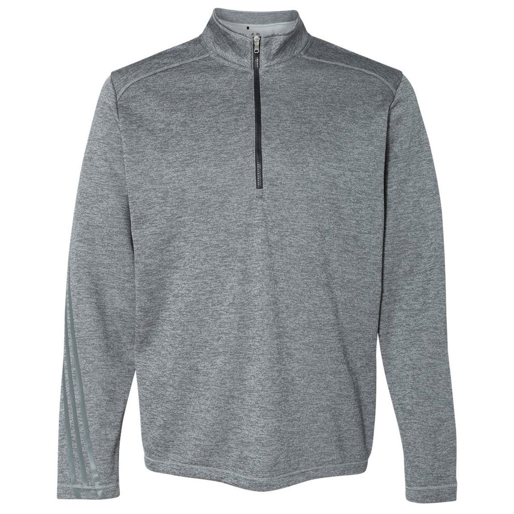 As colder weather descends upon us let the Adidas Golf Men's Mid Grey Heather/Black Brushed Terry Heather Quarter-Zip keep you warm and toasty. Made of 100% polyester with reflective gradient 3-stripes on the right forearm and Adidas logo, the brushed terry offers a professional look with a comfortable feel. Great for layering with custom Adidas polo shirts, these quarter-zip pullovers could serve as part of employee apparel or just an added layer at the next trade show. Add your company logo or corporate embroidery for that little extra on the already amazing pullover. Start your design and place an order today. We are waiting to hear from you!Corresponding Women's Style:Adidas Golf Women's Mid Grey Heather/Black Brushed Terry Heather Quarter-Zip