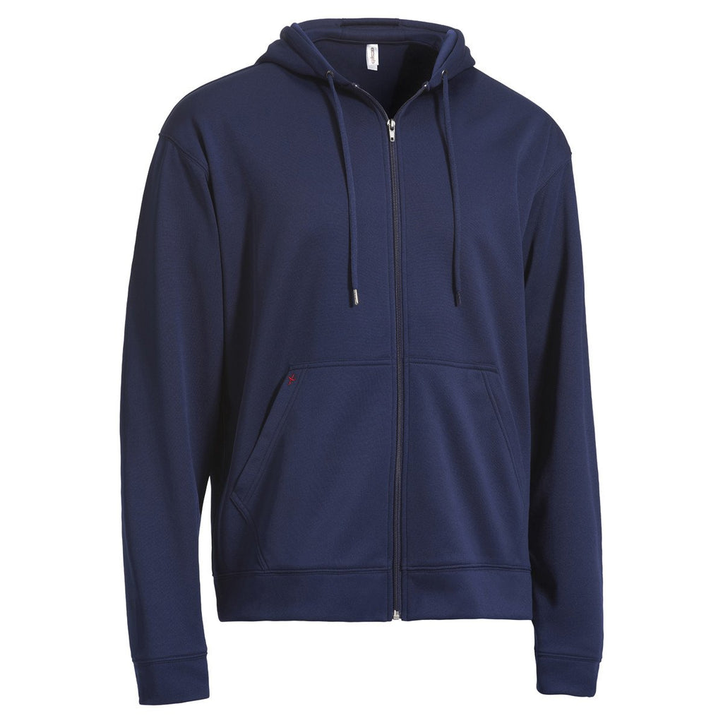 Add a layer of comfort and warmth to your ensemble courtesy of Expert's Expert Men's Navy Tec Full Zip Hoodie. It features a split kangaroo pocket to stash on-the-go essentials while moisture-wicking fibers help you to stay dry. Soft polyester fleece keeps you cozy. Other features include matching cord, self-fabric hood, cuffsand bottom band and anti-static, anti-microbial properties. Add your logo to this men's custom hooded pullover to spread visual representation of your business in a wider world. A perfect item to be used as corporate gift, promotional merchandise or business gifts for men of all ages.Highlights