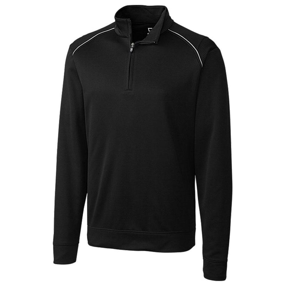 Stay warm in the Cutter & Buck Men's Black Tall WeatherTec Ridge Half-Zip. With the addition of your custom logo, this half-zip is a great way to market your company. The brilliant polyester body offers a comfortable surface to wear in the winter. The lightweight design includes a self-fabric mock collar that bends well and flexes with one's movements. A slight white line can be found on the top part of the outfit. The classic appearance adds a modern look to the outfit. Try this design out if you're looking for a classic approach that has a handsome style of its own for corporate athletic outings. This may also do well as a corporate jacket uniform for cooler times in the year.Highlights