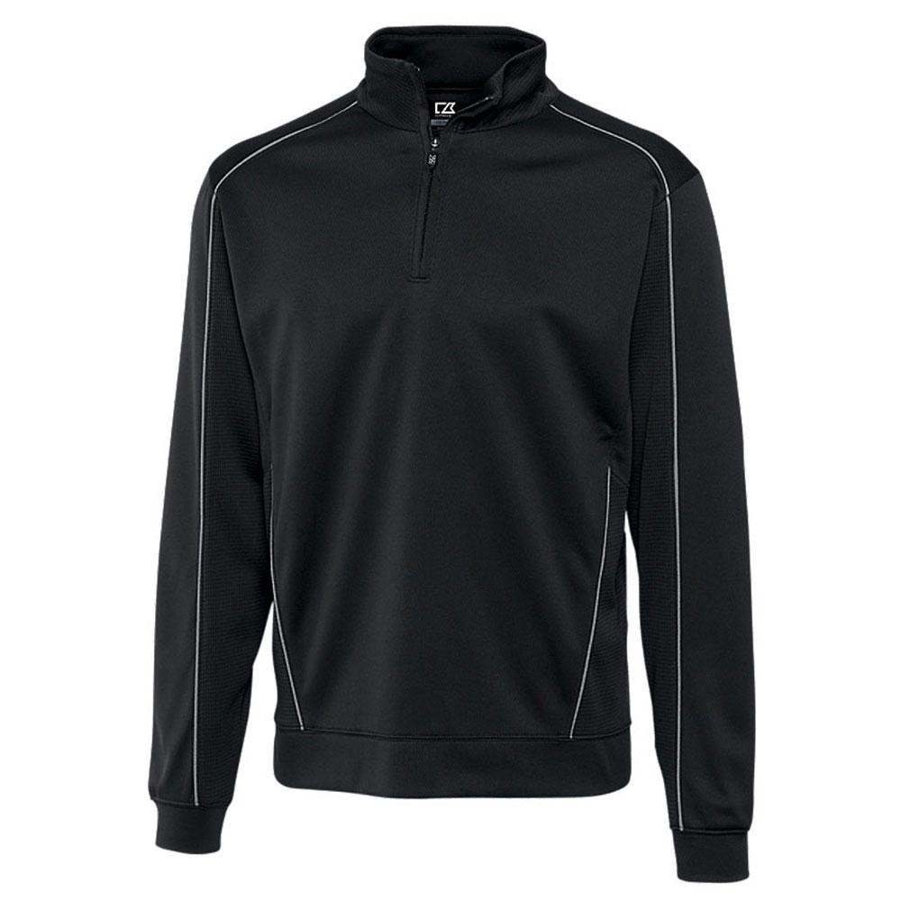 With the addition of your company's custom logo, the Cutter & Buck Men's Black Tall DryTec Edge Half-Zip will make your workers smile. This half-zip is great for use at casual occasions during the fall and winter. The polyester body pairs with a mock collar and a half-zip front for a modern look. Some small grooved accents can be found along the shoulders, sleeves, and sides to establish a comfortable style that allows air to move along. The inside lining is comfortable as well. The design on the half-zip outfit is suitable for many outside needs and does well for golf outings, outdoor recruiting events, and much more.
