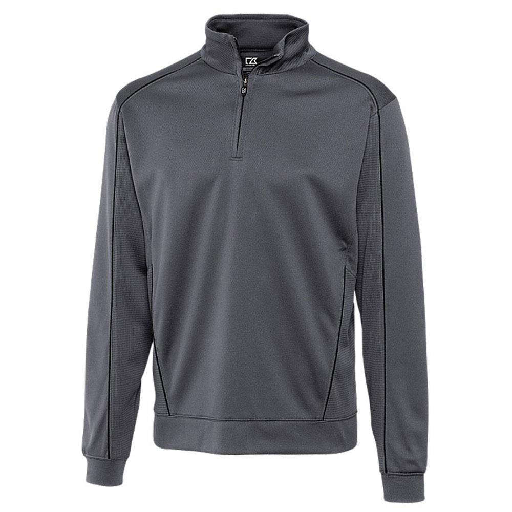 With the addition of your company's custom logo, the Cutter & Buck Men's Elemental Grey/Black Tall DryTec Edge Half-Zip will make your workers smile. This half-zip is great for use at casual occasions during the fall and winter. The polyester body pairs with a mock collar and a half-zip front for a modern look. Some small grooved accents can be found along the shoulders, sleeves, and sides to establish a comfortable style that allows air to move along. The inside lining is comfortable as well. The design on the half-zip outfit is suitable for many outside needs and does well for golf outings, outdoor recruiting events, and much more.Highlights