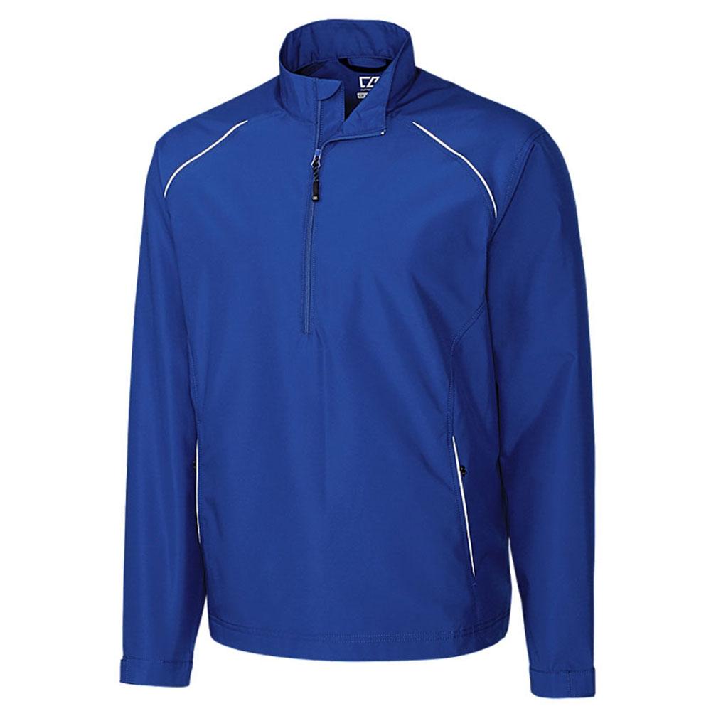 With the addition of your custom logo, the Cutter & Buck Men's Tour Blue Tall WeatherTec Beacon Half-Zip Jacket includes everything you need for an outfit to wear at corporate athletic events. The cuffs on the sleeves can be tightened or loosened by a small bit for the wearer's liking. The half-zip front allows for air to move in when the wearer needs it. The zippered pocketed on the sides include nice off-color accents while adding enough room for the wearer to keep one's hands comfortable. These and many other features, including an outstanding mock neck collar, make this a must for your next employee outing or other corporate event.Highlights