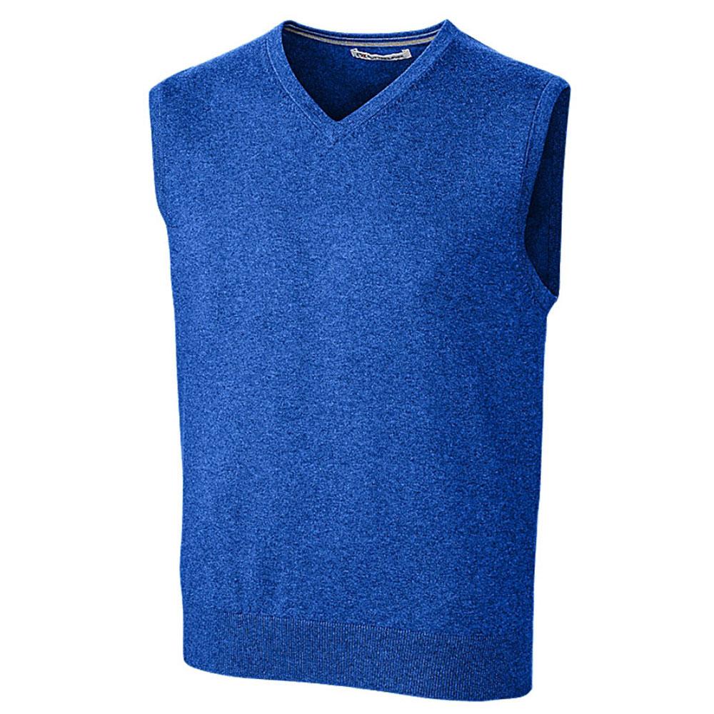 The classic look of the Cutter & Buck Men's Tour Blue Tall Lakemont V-Neck Vest will complement your company's logo well. The vest uses a striking ribbed stitching layout on the arm holes and on the V-neck front. The hem at the bottom has a dense design for a comfortable feel that your employees will appreciate. A contrast line can be found on the inside of the collar to add a better tone for display and wear use. The design mixes in with a good neutral tone that makes the perfect canvas for your custom logo. The soft fabric adds a comfortable touch for wear as well, thus adding a striking surface for anyone's relaxation needs.Highlights