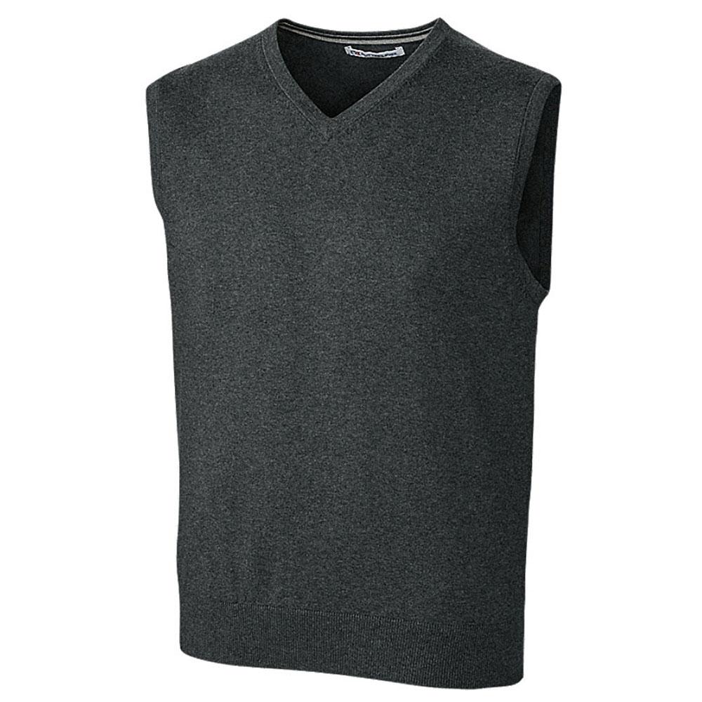 The classic look of the Cutter & Buck Men's Charcoal Heather Tall Lakemont V-Neck Vest will complement your company's logo well. The vest uses a striking ribbed stitching layout on the arm holes and on the V-neck front. The hem at the bottom has a dense design for a comfortable feel that your employees will appreciate. A contrast line can be found on the inside of the collar to add a better tone for display and wear use. The design mixes in with a good neutral tone that makes the perfect canvas for your custom logo. The soft fabric adds a comfortable touch for wear as well, thus adding a striking surface for anyone's relaxation needs.Highlights