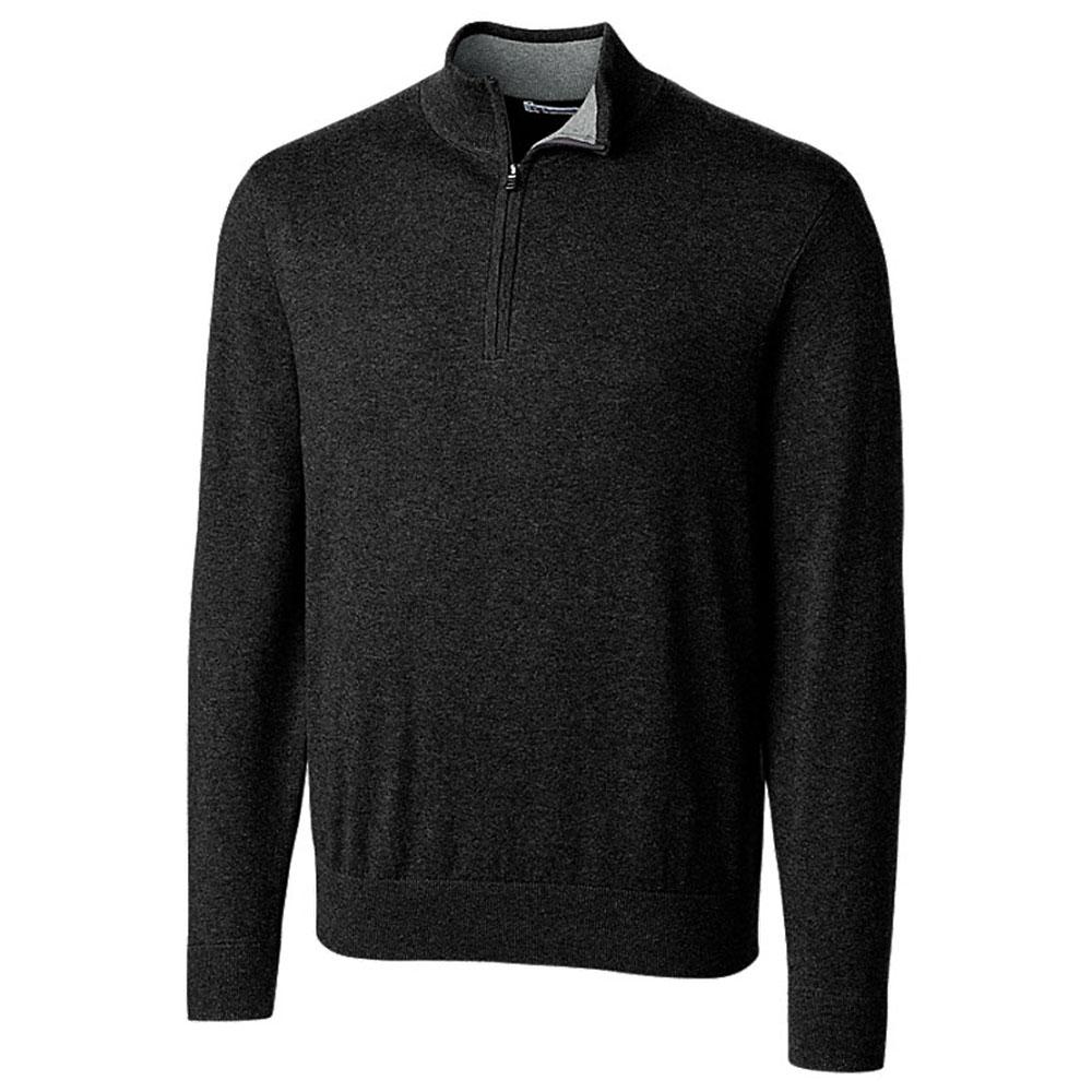 The Cutter & Buck Men's Black Tall Lakemont Half-Zip is the perfect canvas for your company's custom logo. The mix of cotton, nylon, and spandex on this half-zip provides all day wearable comfort for your employees. The half-zip is accentuated with a secondary color on the inside part to create a more vibration and fashionable look. The design on this half-zip outfit is suitable for many fashionable design needs and is comfortable for all people to wear during any special outside event. The good layout has enough room for a custom logo on the front to add a nice personalized touch all the way through.Highlights